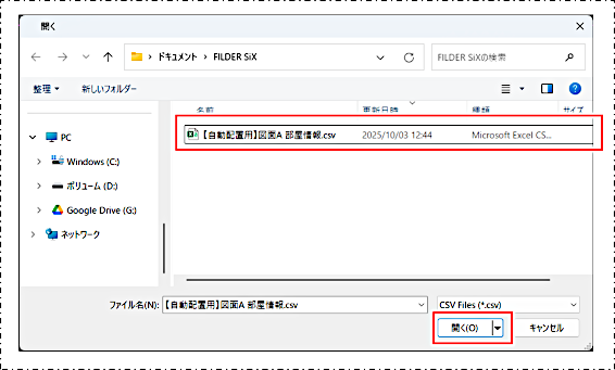[CSVファイルから部屋情報読み込み]ボタンをクリックし、CSVファイルを開きます。