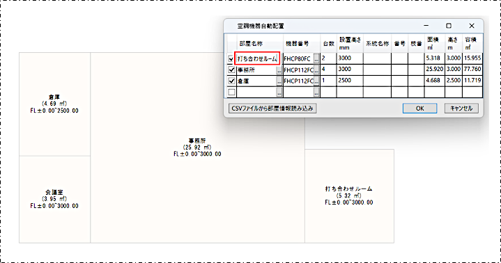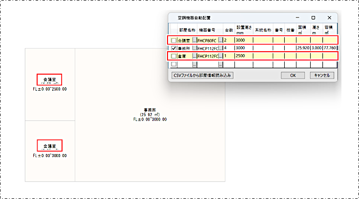 CSVファイルを読み込み、部屋に空調機器を自動配置する