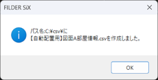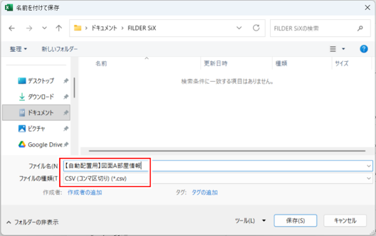 部屋名称が文字化けした場合はCSVファイルの種類が対象外である可能性があります。 「CSV(コンマ区切り)(*.csv)」形式で保存して下さい。 先頭に【自動配置用】という名称が無い場合は、ファイルの読み込み時に自動で【自動配置用】という文字を先頭に追加した同内容ファイルのコピーをコピー元と同じ場所に作成します。