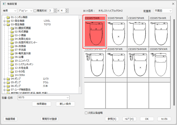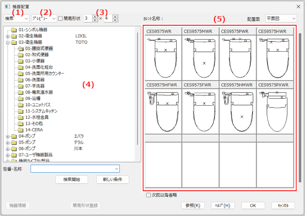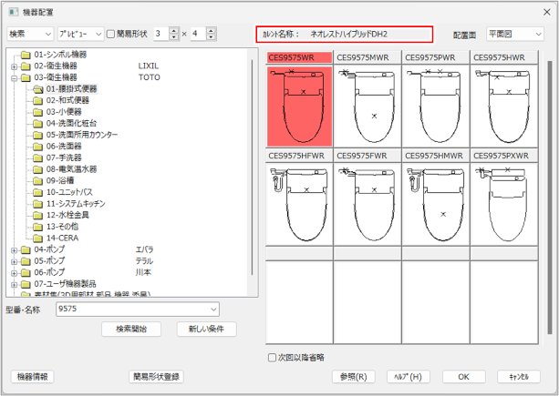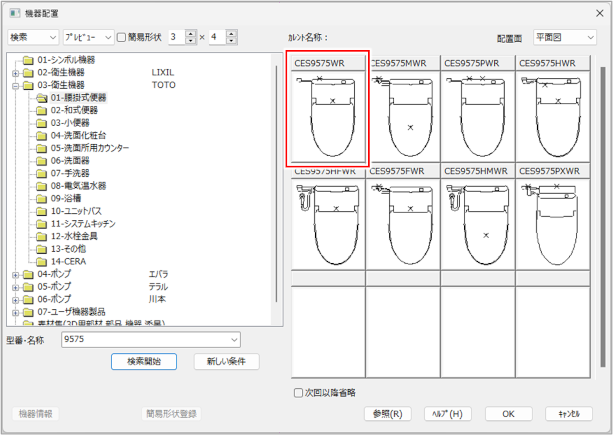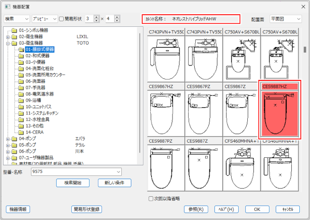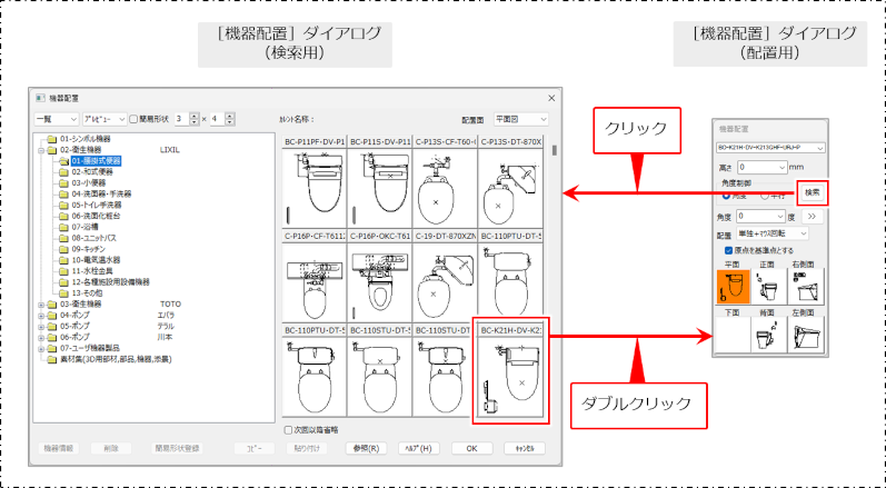 [機器配置]ダイアログには、機器を選択するダイアログと、機器を選択した後に角度や配置面を設定するダイアログの2つがあります。機器をダブルクリック、または[検索]ボタンをクリックして操作します。
