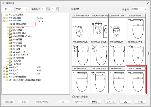 配置する製品の分類フォルダをクリックし、機器をクリックします。