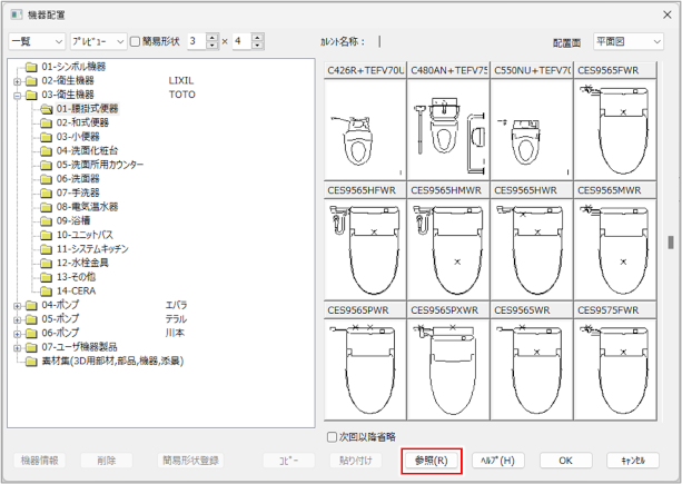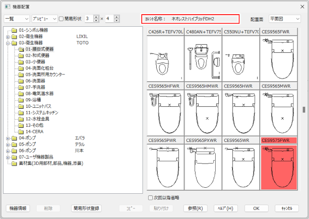 [機器配置]コマンド実行時に、[機器配置]ダイアログを表示しない場合は、チェックを付けます。 チェックを付けると、前回選択した機器を選択した状態で配置用の[機器配置]ダイアログが表示されます。 |