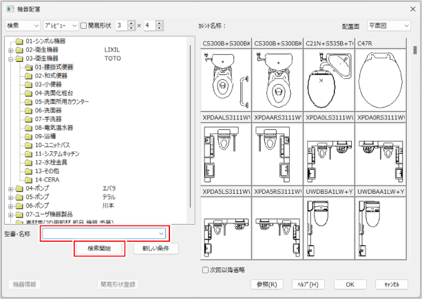 [型番・名称]に機器の型番や名称を入力し、[検索開始]ボタンをクリックします。
