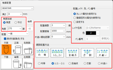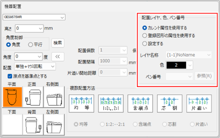 [機器配置]ダイアログの詳細設定が表示されます。 配置レイヤ、色、ペン番号を変更したり、[配置]で[一括]を選択した場合の配置方法を設定したりできます。詳しくは、以下を参照してください。 |