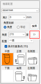 [角度制御]で[角度]を選択した場合に、機器を配置する角度を入力します。 [配置]で[単独+マウス回転]を選択した場合は、配置位置を指示した後、マウス操作で角度を変更できます。 [単独]を選択した場合は、配置前に[←]キーや[→]キーでも角度を変更できます。 |