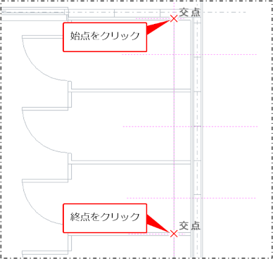 [片追い]:指定した範囲の始点から[片追い開始距離]の設定値に1個目の機器が配置され、残りの機器は[配置間隔]の設定値で配置されます。