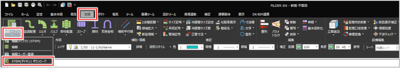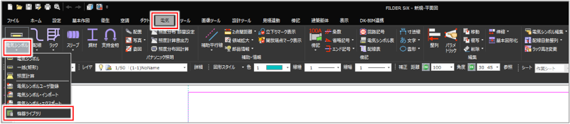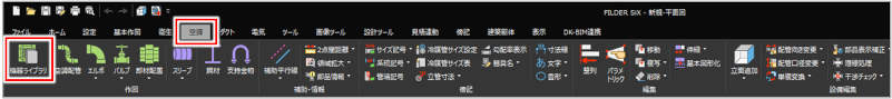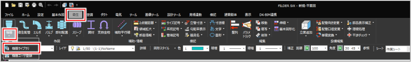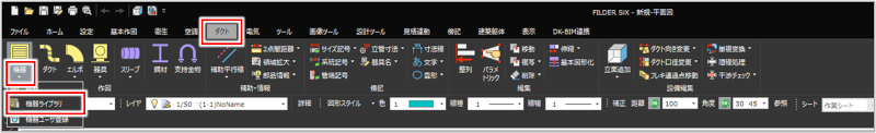 [衛生]タブ>[機器]プルダウンメニュー>[機器ライブラリ] [空調]タブ>[機器ライブラリ] [ダクト]タブ>[機器]プルダウンメニュー>[機器ライブラリ] [電気]タブ>[電気シンボル]プルダウンメニュー>[機器ライブラリ] |