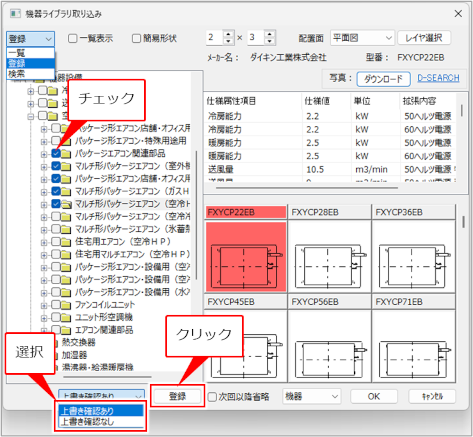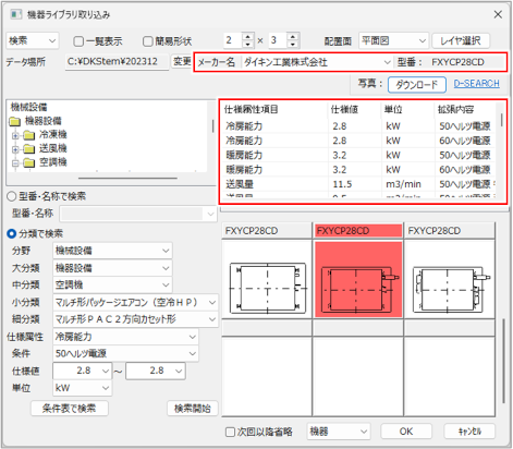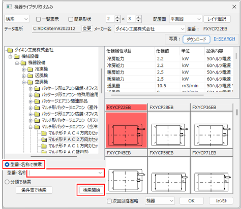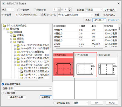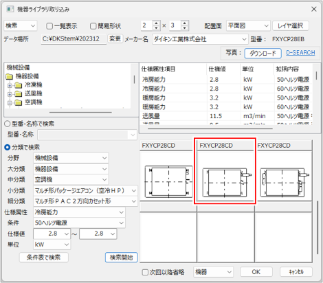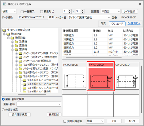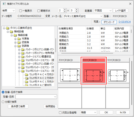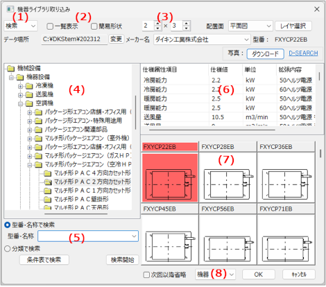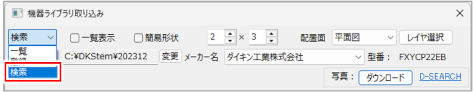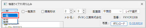 (7)のファイル表示方法を選択します。 [一覧表示]と[簡易形状]にチェックを付けていない場合は、型番と機器のプレビューが表示されます。