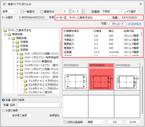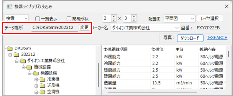 機器データのインストール先を変更した場合など、検索時に機器データが表示されないときは、[データ場所]の[変更]ボタンをクリックし、機器データが入っているフォルダを指定します。標準のインストール先は「C:\DKStem\(バージョン)」フォルダです。