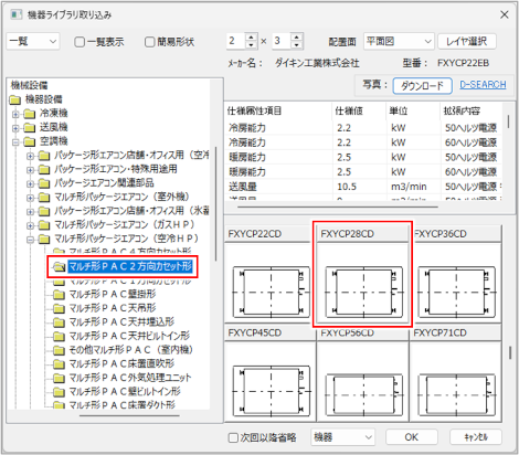衛生機器・空調機器・ダクト機器を、機器ライブラリから選択して配置します。