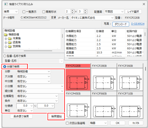 [分類で検索]を選択して、機器の分類や条件を入力し、[検索開始]ボタンをクリックします。