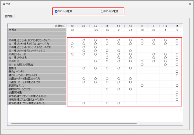 条件表から分類を設定する場合は、[条件表で検索]ボタンをクリックして、電源周波数を選択し、表の〇部分をクリックします。 |