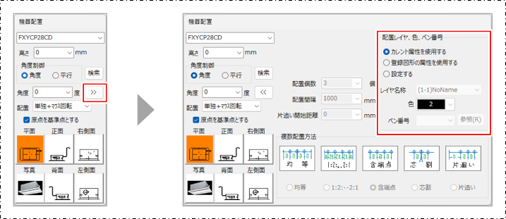 設定項目は[機器配置]コマンドの配置用の[機器配置]の詳細設定と同様です。詳しくは、以下を参照してください。 |