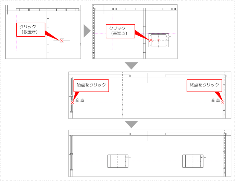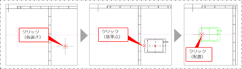 [機器配置]ダイアログで[原点を基準点とする]のチェックを外している場合は、図面の何もないところに機器を仮置きし、基準点を指定してから配置します。
