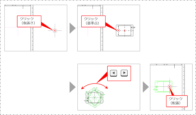 [機器配置]ダイアログで[原点を基準点とする]のチェックを外している場合は、図面の何もないところに機器を仮置きし、基準点を指定して[←]キーまたは[→]キーで角度を調整してから配置します。