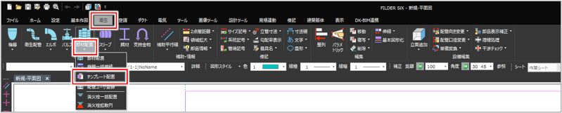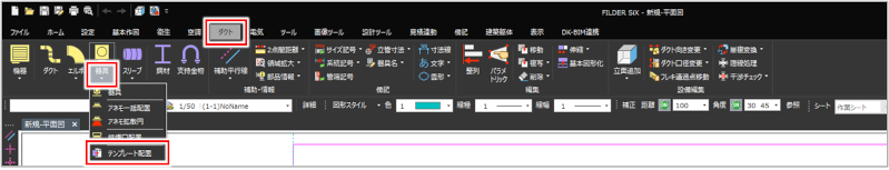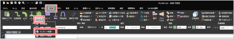 FILDER SiXに登録されている配管部品・ダクト部品・機器を[テンプレート配置]コマンドで配置します。[テンプレート配置]コマンドでは、衛生・空調・ダクトに関わらず、FILDER SiXに登録されている部品を呼び出します。