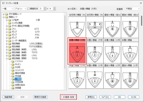 3D形状を登録または削除する機器を選択し、[3D登録・削除]ボタンをクリックします。