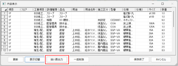 [内容表示]ダイアログが表示され、拾いで集計した部品の一覧が表示されます。
