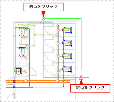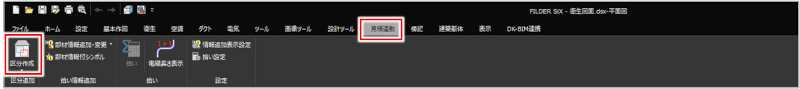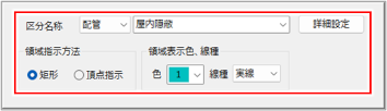 区分を作成する対象([配管][ダクト][電気])と、施工区分の名称を選択します。 施工区分の名称は任意の文字列を手入力できます。同じ図面で一度入力した名称は、プルダウンメニューから選択できます。 |