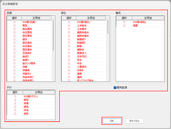 [区分名称]で選択した対象の用途を選択する場合は、[詳細設定]ボタンをクリックします。 [区分詳細設定]ダイアログが表示されるので、[選択]欄をクリックして選択するかどうかを切り替え、[OK]ボタンをクリックします。