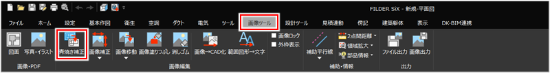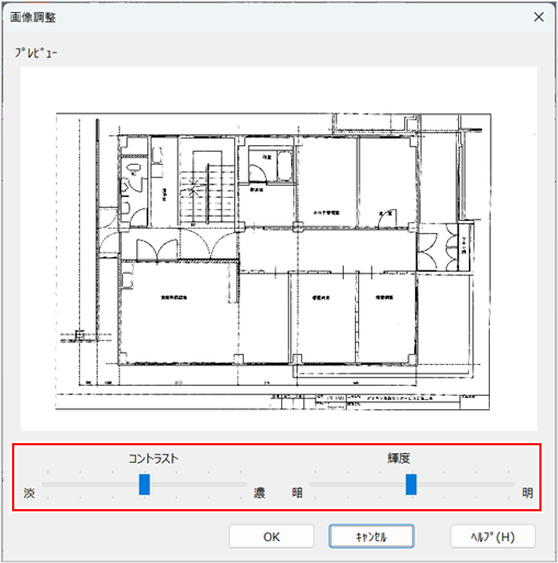 [青焼き補正]コマンドを使用して、スキャンして取り込んだ青焼き図面の画像データを、一度に自動で補正(色補正・ゴミ取り)できます。