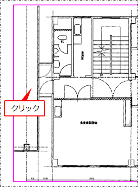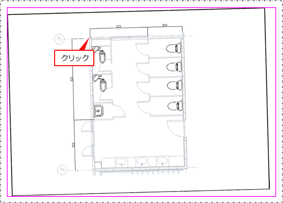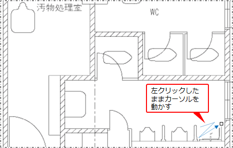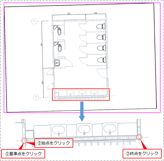 回転する基準点をクリックし、基準線の始点・終点をクリックします。
