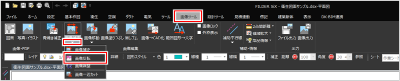 [画像ツール]タブの[画像補正]プルダウンメニューから[画像反転]コマンド(