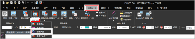 [画像ツール]タブの[画像補正]プルダウンメニューから[画像調整]コマンド(