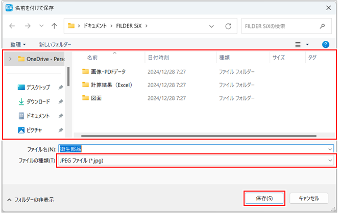 [名前を付けて保存]ダイアログで保存先を指定して、[ファイルの種類]プルダウンメニューからファイル形式を選択し、[保存]ボタンをクリックします。