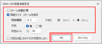 [DWG・DXF図面情報設定]ダイアログが表示された場合は、図面情報を設定し、[OK]ボタンをクリックします。