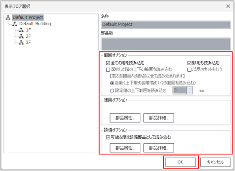 [表示フロア選択]ダイアログで、読み込む範囲と建築・設備オプションを選択し、[OK]ボタンをクリックします。