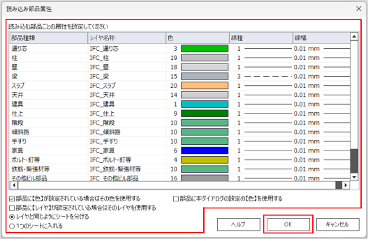 [全ての階を読み込む][敷地も読み込む]は、選択した階に関わらずIFCファイル全体で1つの設定となります。この2項目以外は、選択した階ごとに設定が必要です。