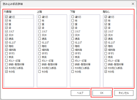 読み込む建築部品の種類を選択する場合は、クリックします。 [読み込み部品詳細]ダイアログで、読み込む建築部品にチェックを付けて[OK]ボタンをクリックします。
