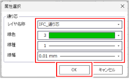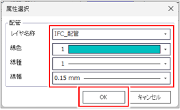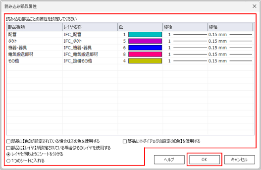 読み込む設備部品のレイヤ、線色、線種、線幅(ペン番号)の属性を設定する場合は、クリックします。 [読み込み部品属性]ダイアログで設備部品の属性を設定して、読み込む方法を設定し、[OK]ボタンをクリックします。