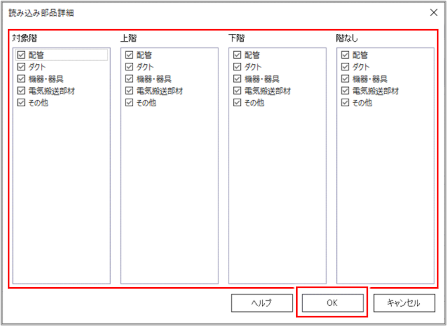 読み込む設備部品の種類を選択する場合は、クリックします。 [読み込み部品詳細]ダイアログで、読み込む設備部品にチェックを付けて[OK]ボタンをクリックします。