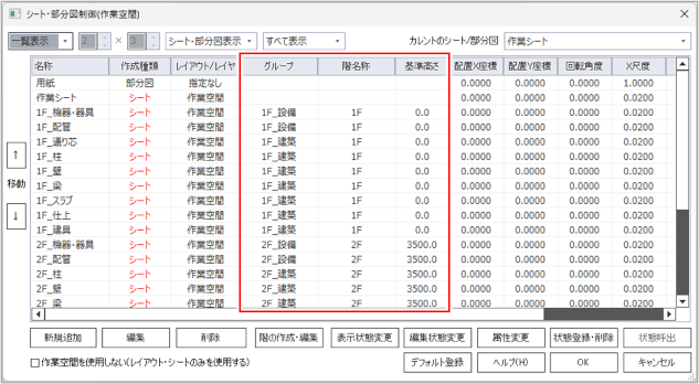 各階の階情報(グループ・階名称・基準高さ)が自動的に設定され、階ごとのシートに読み込まれます。 シートについて、詳しくは以下を参照してください。