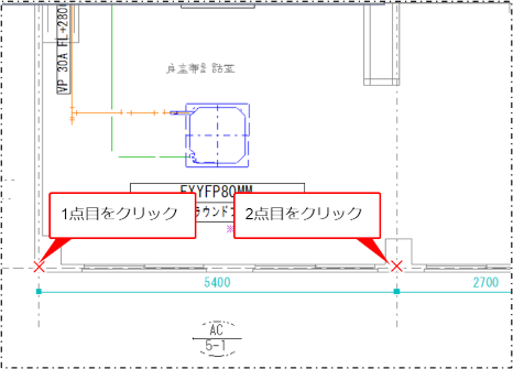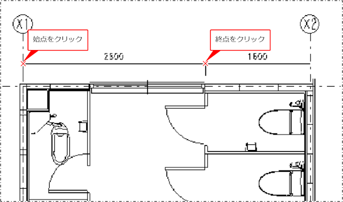 手順3で入力した寸法と同じ寸法線の始点・終点をクリックします。