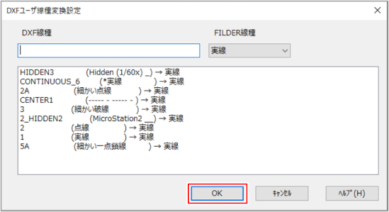 [DXFユーザ線種変換設定]ダイアログが表示された場合は、[OK]ボタンをクリックします。