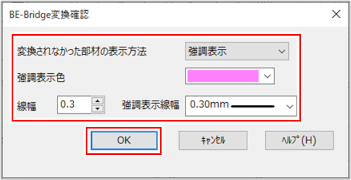 FILDER SiXデータに変換できなかった図形がある場合は、[BE-Bridge変換確認]ダイアログで設定した方法で表示されます。