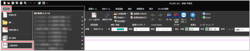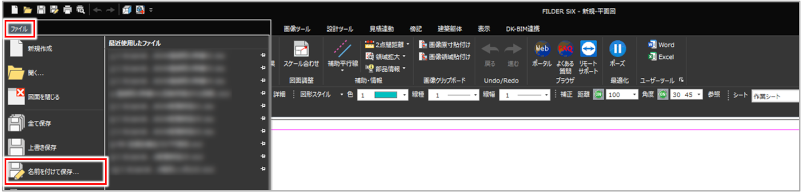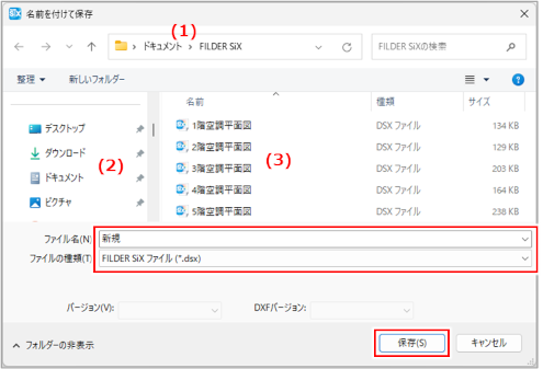 FILDER SiXで一度も保存していない新規図面やFILDER SiX図面ファイル以外の図面を読み込み、上書き保存しようとすると、[名前を付けて保存]ダイアログが表示されます。ファイルに名前を付けて保存してください。