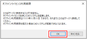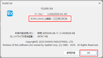 バージョン情報ダイアログの[オフラインライセンス期限]に使用期限が表示されます(オンライン起動時は[未使用]と表示されます)。[OK]ボタンをクリックしてダイアログを閉じます。