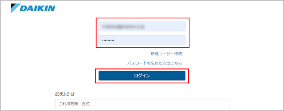 メールアドレスとパスワードを入力し、[ログイン]ボタンをクリックします。