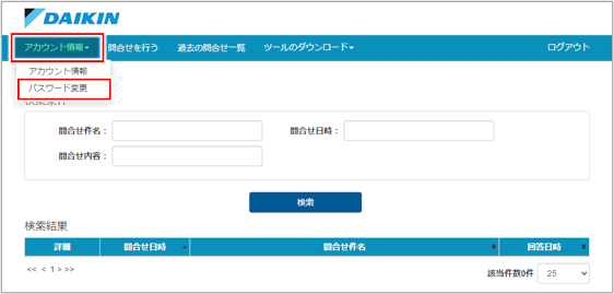[アカウント情報]プルダウンメニューから[パスワード変更]をクリックします。