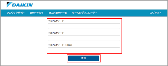 現在のパスワード(仮パスワード)を[旧パスワード]に入力して、新しいパスワードを[新パスワード][新パスワード(確認)]に入力し、[送信]ボタンをクリックします。
