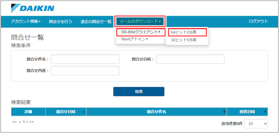 [ツールのダウンロード]プルダウンメニューから[DK-BIMクライアント]を選択し、[64ビットOS用]をクリックします。