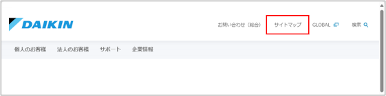 ダイキン工業株式会社のホームページ(https://www.daikin.co.jp/)を開き、[サイトマップ]をクリックします。