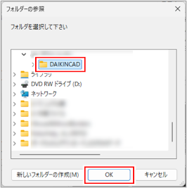 ダウンロードしたファイルの展開先の[DAIKINCAD]フォルダを選択し、[OK]ボタンをクリックします。