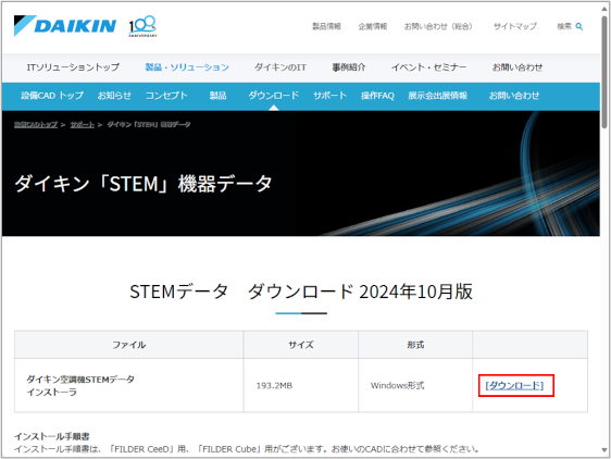 ダイキン工業のホームページからインストールします。最新の空調機データをインストールできますが、3D表示に対応していない場合があります。 詳しくは、以下を参照してください。 |