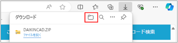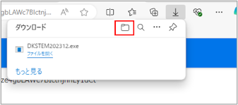 Microsoft Edgeの場合は、ブラウザ右上のフォルダマークをクリックします。ポップアップや [↓]マークが表示されていない場合は、画面右上の[…]をクリックし、プルダウンメニューから[ダウンロード]をクリックすると表示されます。