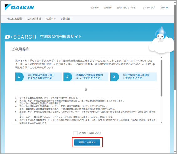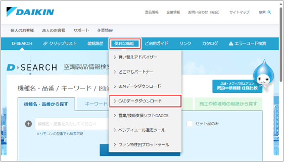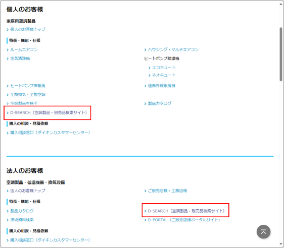 [D-SEARCH(空調製品・別売品検索サイト)]は、「個人のお客様」と「法人のお客様」にありますが、どちらをクリックしても同じページが表示されます。